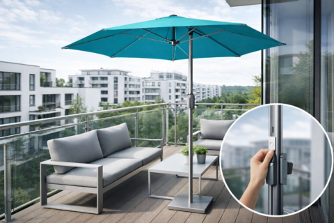 Intuitiver Komfort für große Schirme – Ein Schiebesystem ermöglicht das einfache Aufspannen auch sehr großer Schirme ohne großen Kraftaufwand. Ideal für den professionellen Einsatz in der Gastronomie oder für große private Terrassen.