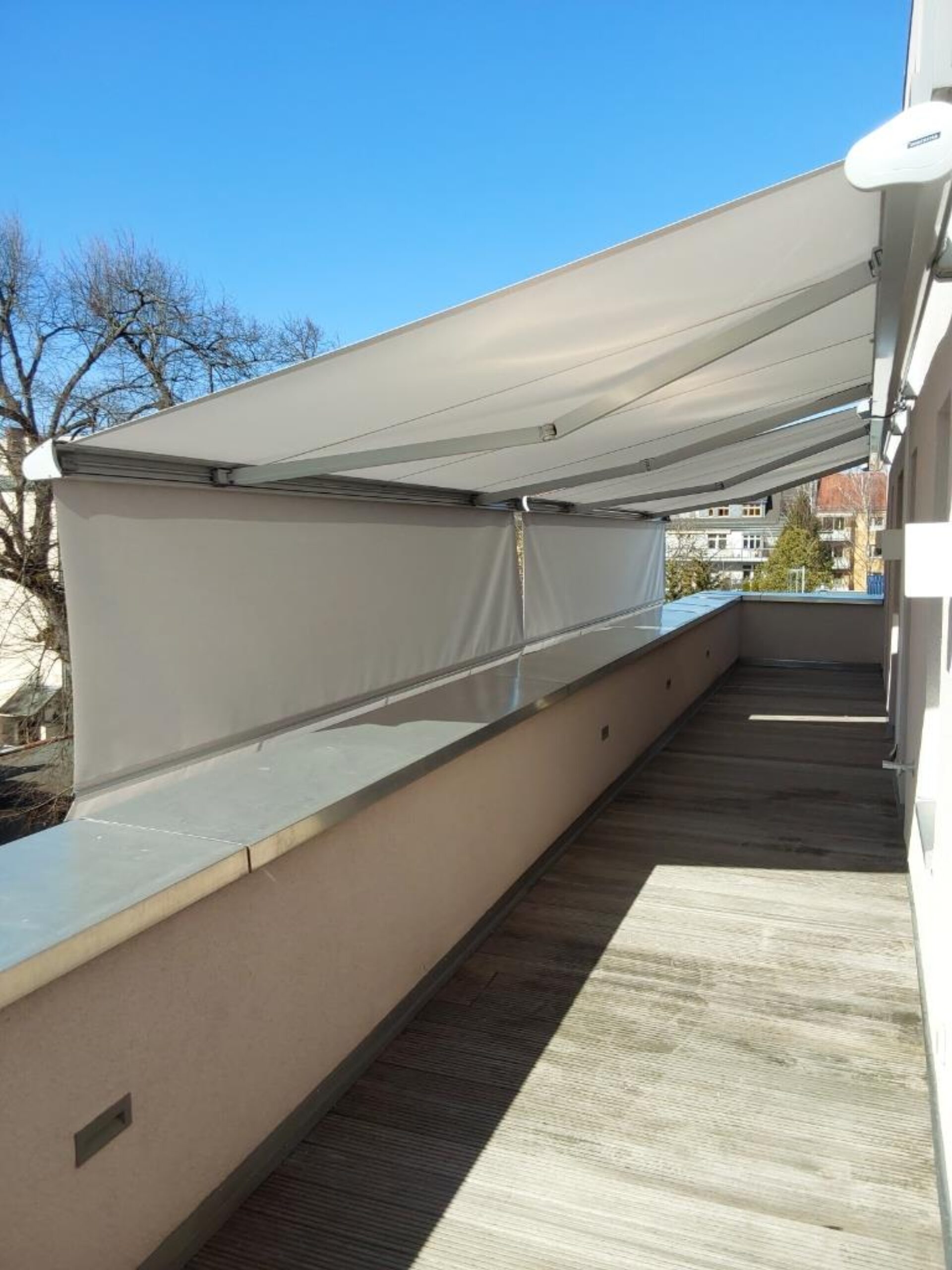 Familie G. wünschte sich einen Sonnenschutz für den exponierten umlaufenden Balkon. Die Kassetten-Markisen sollten sowohl bei hoch-, sowie bei niedrigstehender Sonne einen Sonnenschutz bieten. Des Weiteren wurde sich die Installation einer Smart-Home-Steuerung und die Bedienung über eine App gewünscht.