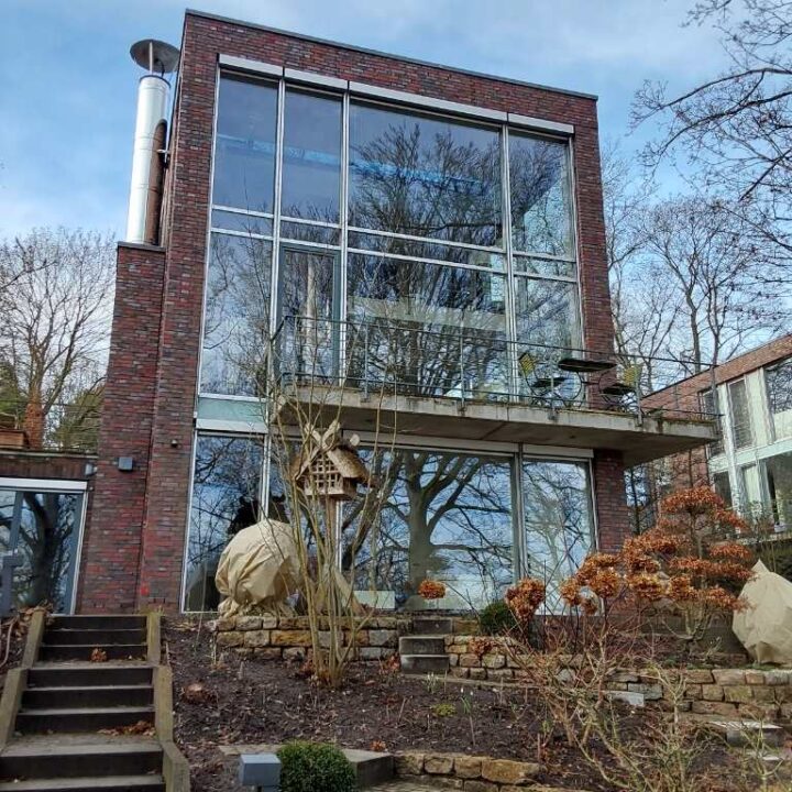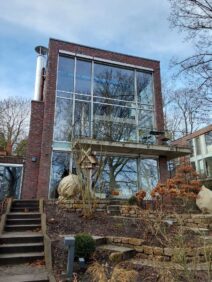 Die Familie W. wünschte sich ein Austausch der bestehenden Sonnenschutzanlagen und eine Integration der neuen Senkrechtmarkisen in die Gebäude-KNX-Steuerung. Der Kundenwunsch war außerdem einen Blick über den See zu ermöglichen, bei geschlossenen Zustand keine Einblicke von außen zu gewähren und bei geöffnetem Zustand Licht durch die fast 6,0 Meter hohe Fensterfassade ins Gebäude zu lassen.